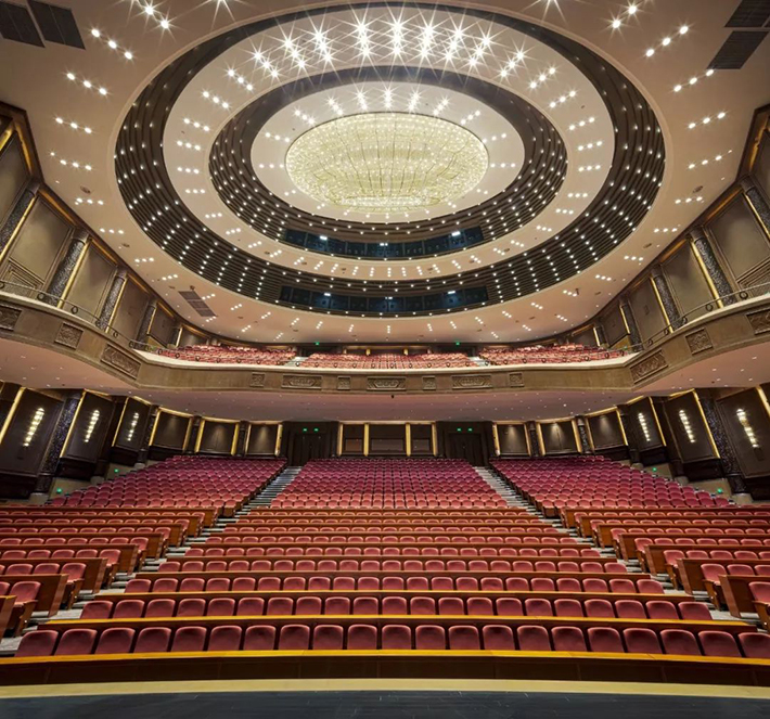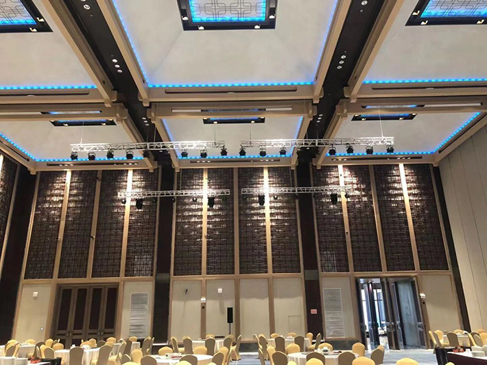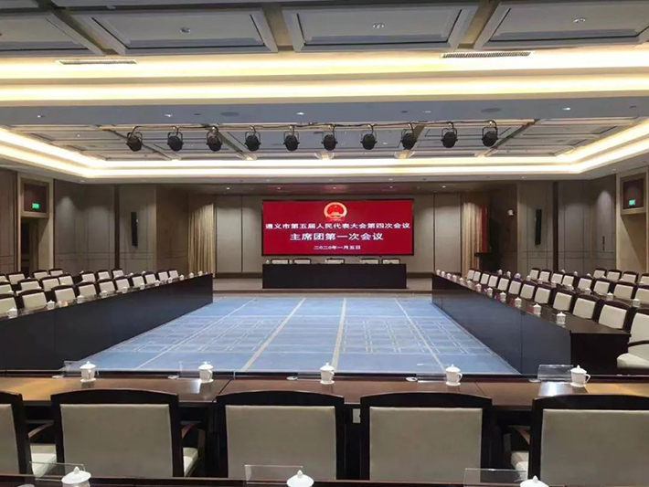 在遵义会议中心多个会场内,设计方案时根据不同会议场景的使用需求,匹配了最为合适的灯光安装方案,并且配置舞台灯光控制系统,采用DMX信号控制,可任意调整灯具投射角度、亮度、光束大小、颜色等功能,一台电脑就可轻松掌控全场灯光。