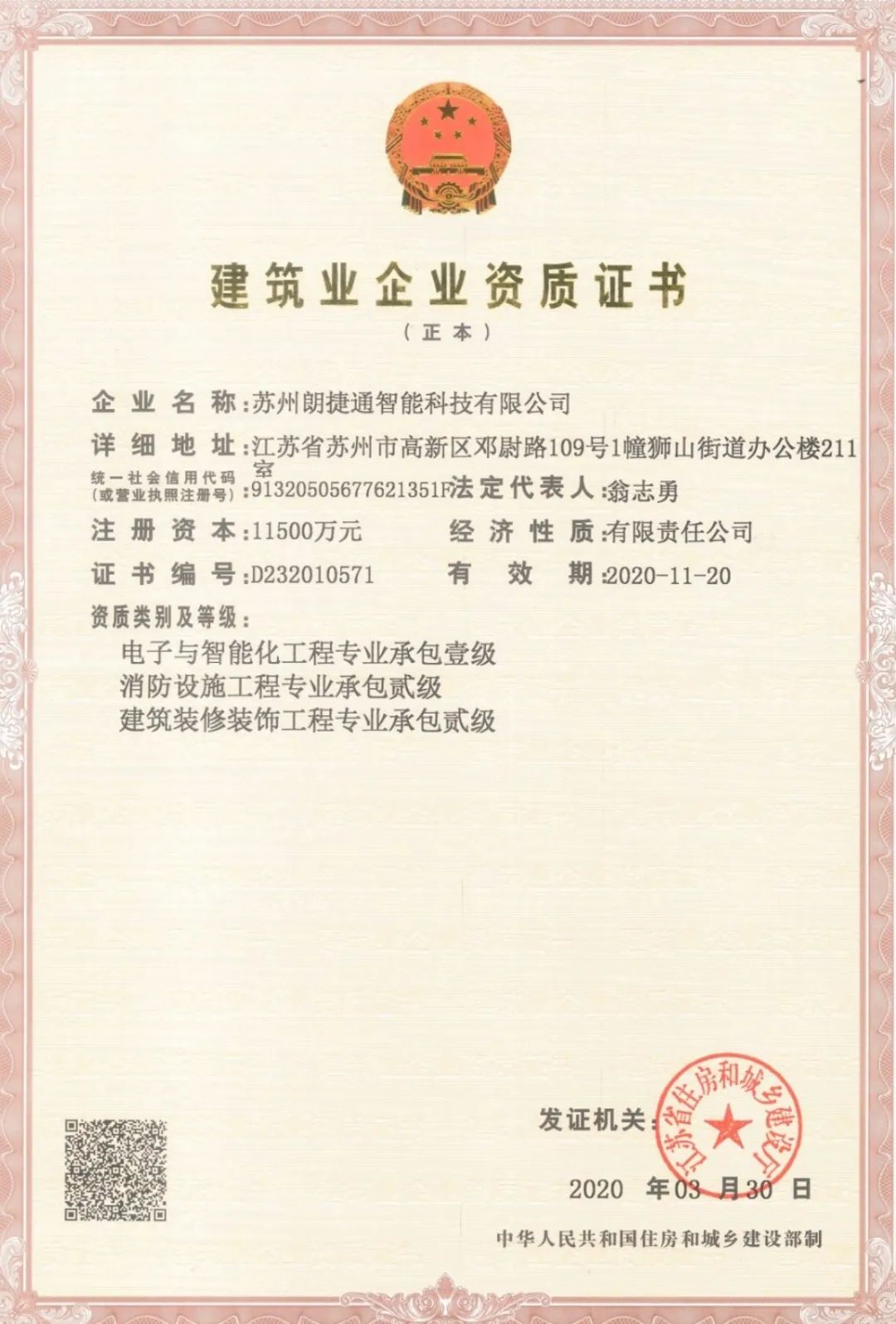 2020年3月,经江苏省住房和城乡建设厅批准,苏州朗捷通智能科技有限公司成功获得了消防设施工程专业承包贰级资质。