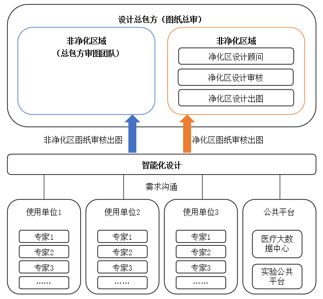本项目中真正实施设计施工一体化的单位是各分包单位,分包单位分智能化分包、装饰分包、净化分包及消防分包,每个分包单位均直接对设计总包和施工总包进行负责。每个分包单位承担边设计边施工的职责,设计的过程图纸和最终成果由设计总包方进行审核及出图;施工质量、进度、造价由施工总包进行监督和把控。