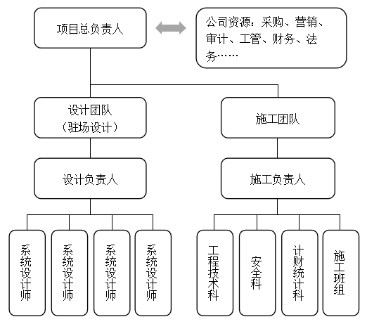 本项目建筑面积大、系统全、质量要求高,而且工期较为紧张。针对这一情况,我司集中优势管理人员对其进行管理,安排人员分工和职责。其中项目总负责人负责项目整体关键进度节点的把控、关键质量的把控、重大问题的协调解决,协调外部与内部各种资源,对整个项目起到统筹规划的作用。