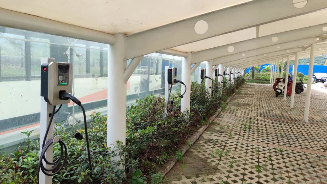 增设电车充电桩,更添便利:随着新能源车越来越普及,电车充电桩也成了公共建筑的标配设施。金融新天地内的电动汽车棚内同时配备慢充和快充两种不同类型的充电桩,支持二维码扫码付款,在后台即可设置收费标准。