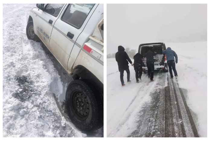 暴雪:项目初期,当地日平均气温维持在零下20度,4月中旬仍飘着漫天大雪,积雪深厚经常封山封路,尤其距景区30多公里外的218国道上山路陡峭,下雪导致封路好几天,而项目部距县城有70多公里、距伊梨州近300公里,因此材料采购及运输十分困难,有时甚至会堵上三四天。