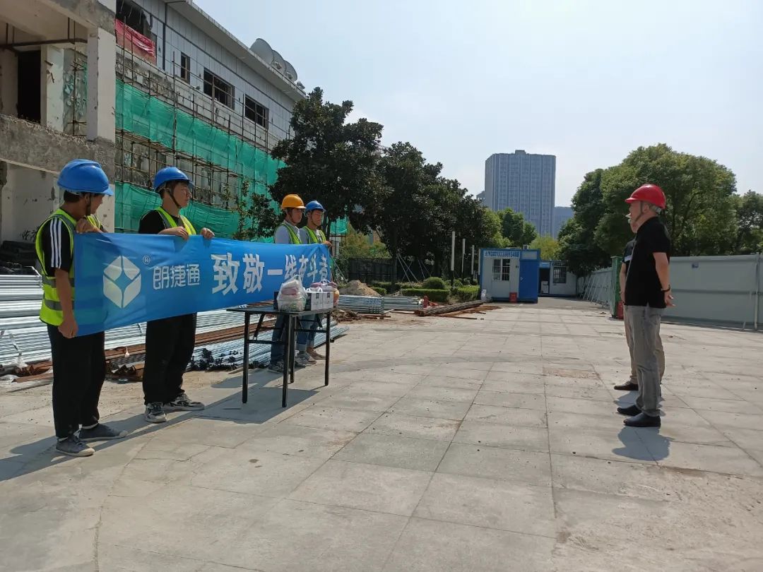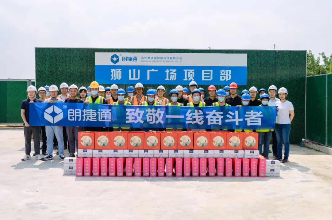 在苏州狮山广场项目,集团总裁朱明、朗捷通董事长翁志勇、总裁林海走访项目工地,深入了解金朵云数字智慧平台的应用,为一线项目人员及施工班组送上慰问品与节日问候。